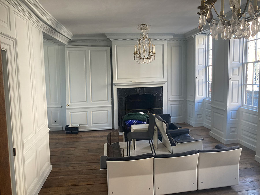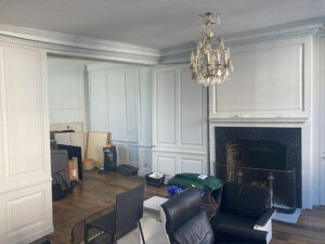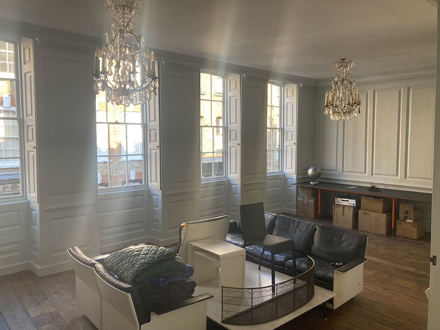 This interior painting project in Whitechapel focused on transforming a large living room with dark wooden panelling into a lighter, more inviting space. The original finish felt heavy and enclosed, absorbing natural light and making the room appear smaller than it was. The client wanted to move away from these darker tones and create a softer, brighter atmosphere that would open up the space while still keeping a sense of elegance and character.