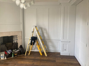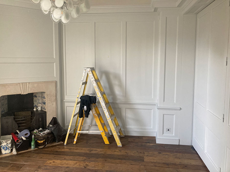 Careful preparation was essential due to the detailed panelling throughout the room. Every surface was properly sanded, cleaned, and primed to ensure a smooth and durable finish. The chosen colour, Mylands Saint Johns™ No.64, is a light, cool teal-tinted shade that brings a refined balance between freshness and sophistication. Its subtle blue and green tones, softened with gentle hints of grey, create a calm and versatile backdrop that responds beautifully to natural light, enhancing the architectural details rather than overpowering them.
